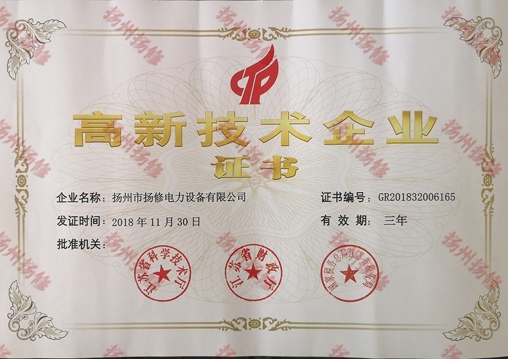 近幾年來,揚州市揚修電力設(shè)備有限公司致力于核心技術(shù)自主創(chuàng)新,不斷加強研發(fā)投入力度,涌現(xiàn)出一大批創(chuàng)新產(chǎn)品及專利技術(shù)。為此,經(jīng)江蘇省科學(xué)技術(shù)廳、江蘇省財政廳、國家稅務(wù)總局江蘇省稅務(wù)局審查通過,于2018年11月30日聯(lián)合頒發(fā)認證證書。
